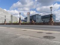 A view of a modern city street in Berlin, Germany. The road surface is lined with statues and a lamp post. Two high-rise buildings dominate the urban skyline. Clear sky and urban design exemplify the beauty of European architecture.