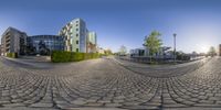 a fish eye lens panoramic picture of buildings on a city street near water
