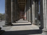 A clear sky over Berlin illuminates the classic architecture of the Altes Museum. The straight road and walkway create symmetry, while the columns and arches add to the historic charm. A popular tourist attraction in the heart of the city.