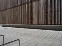 A sunny day in Berlin, Germany showcasing the city's modern architecture. Concrete and metal facades line the urban streets, casting shadows on the asphalt and brickwork. The wood walls and flooring add warmth to the public spaces, creating a harmonious urban design.