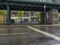 This stock photo depicts a cityscape of Berlin, Germany, with a street under an overpass. The image captures a traffic light on the street next to a metal barrier. The urban scene showcases buildings, trees, and vegetation. The road surface appears wet, giving it a reflective ambiance. The asphalt road extends into the distance, highlighting the urban design of the area. This photograph represents the urban landscape of Berlin, a vibrant city in Europe.