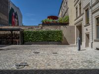 Classic architecture in Berlin's residential area. Cobblestone streets lead to a courtyard with open space and urban design. Hard shadows play on brick walls under a clear European sky. A glimpse of city life in Berlin.