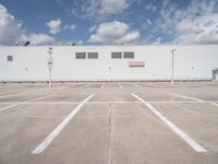a large white building sitting next to a parking lot under blue skies and clouds on a clear day