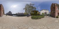 A panoramic view of Berlin, Germany. The fisheye lens captures the city's architectural beauty, with buildings, a clock tower, and a park by the water. A perfect blend of classic and modern architecture.