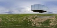 a reflection of a curved building on a green field under a blue cloudy sky and in the distance it's a field that has grass