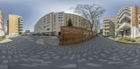 A panoramic view of Berlin, Germany showcasing the modern architecture and urban design of the city. Residential areas with high-rise buildings line the streets. Clear skies and sunlight illuminate the bustling city life.