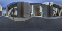 a very wide angle panoramic picture showing an urban intersection in front of a building