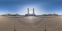 A panoramic view of a square in Berlin, Germany. Two buildings stand on either side, showcasing the city's architectural diversity. The clear sky and sunshine create a vibrant atmosphere, while the circular lens adds a unique perspective.