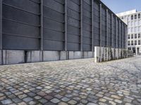 cobblestone floor with multiple sizes, in front of industrial style building and concrete wall