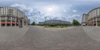 a fish eye view of a very big city with no traffic on the street and large buildings on either side