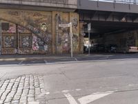 Overhead view of a graffiti-covered building in Berlin, Germany. Classic architecture blends with urban design. Vibrant graffiti wall stands out against the city's asphalt roads. A snapshot of Europe's vibrant art scene.