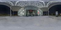 The modern and symmetrical entrance of a convention center in Berlin, Germany. The glass walls and artificial light create a striking and business-like atmosphere. The dark foreground adds depth to the composition.