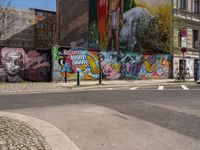 a wall with different colorful artwork on it in a city with buildings around and the street has a bike path going under it