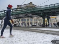 A woman running on a snowy street in Berlin, Germany. The bridge overlooks a bustling city, creating an urban winter scene. Grey sky sets the tone as tram travels through the metropolitan area.