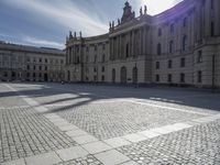An idyllic scene in Berlin, Germany. Classic architecture is showcased in the large castle-like building surrounded by an empty cobblestone walkway. The sun casts hard shadows and adds a touch of warmth to the city's vibrant urban design.