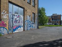 A shabby Berlin wall decorated with graffiti under a clear sky. Hard shadows cast on the industrial, brick facade typical of Europe's art districts, evoking Germany's urban creativity and vibrant city life.