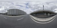 Panoramic view of Berlin's modern architecture. The wide-angle shot captures the bustling city, with its high-rise buildings and straight roads. The highway stretches into the distance, surrounded by a mix of residential areas and industrial infrastructure.