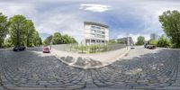 A fisheye lens captures the vibrant streets of Berlin, Germany. Modern architecture blends with cobblestone roads and iron fences. Clear sky casts hard shadows on the bustling business district of Europe's urban design capital.