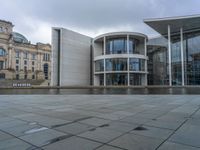 A gloomy day in Berlin. The grey sky contrasts with the modern architecture and concrete walls. The river and canal add to the urban design of the city. Open spaces and paver surfaces provide a glimpse of city life in Europe.