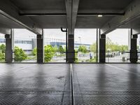 This stock photo depicts a modern architecture building in Berlin, Germany. The image shows an empty parking garage with several windows open and trees in the distance under the canopy. The design of the building showcases the urban and metropolitan area of Berlin. The concrete street and flooring, along with the glass windows and doors, create a sense of symmetry and urban design. The composition of the image emphasizes straight lines, rectangles, and composite materials. The surrounding vegetation, including grass and trees, adds a touch of nature to the urban landscape. Overall, this photo captures the essence of city life in Berlin, Europe, with its modern architecture and open spaces.