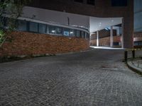 Night-time in Berlin's urban landscape, featuring classic architecture and cobblestone streets. Artificial light illuminates brick walls and storerooms in the city center. A glimpse into Europe's urban design and vibrant city life.