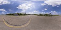 a fish eye view shows the intersection of the road and house in it, with clouds in the sky and a light blue sky above