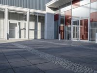 an empty sidewalk with large glass doors and no people walking down it next to a building