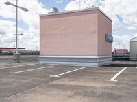A view of a modern architecture building in Berlin, Germany. The building's facade is made of composite materials, contrasting with the clear sky above. The urban design incorporates open spaces, parking decks, and street lights, creating a vibrant city life.