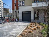 several bicycles are lined up outside a city apartment building and parking lot with a large garage