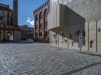 cobblestone driveway surrounded by modern buildings on sunny day with sun reflecting onto the windows