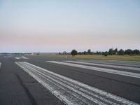 An endless road in Berlin stretches under a clear sky at dawn. The urban landscape features modern architecture and open spaces, highlighting the city's unique blend of nature and urban design.