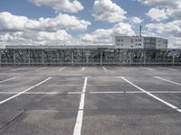 This image captures an empty parking lot in the city of Berlin, Germany. The modern architecture and urban design can be seen in the surrounding buildings and the open space of the parking deck. The clear sky and clouds in the background create a serene atmosphere. This photo represents a typical day in the city, showcasing the straight road lined with asphalt and the fenced off building in the foreground. It provides a glimpse into the city life and the urban landscape of Berlin in Europe.
