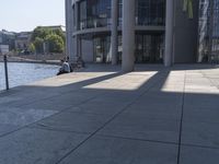 A man sitting on the curb overlooking the river in Berlin. The modern architecture of the office buildings contrasts with the natural vegetation and the calm water. A peaceful day in the bustling business district of Berlin.