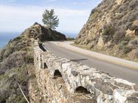 Elevated road along the breathtaking Big Sur coastline in California, USA. The road curves around a large stone wall, offering stunning views of the ocean and mountainous landscape. A perfect day for a scenic coastal drive.