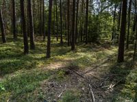 A scenic landscape in Brandenburg, near Berlin. Lush green forest with pine tree trunks and dead branches. Off-road track surrounded by grass and gravel surface. A peaceful day in nature.