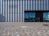 A modern office building located in the business district of Bremen, Germany. The building features a sleek glass front door area, reflecting the surrounding architecture. The brick path leading to the building adds a touch of charm to the industrial surroundings.