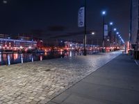 A night view of the city of Bremen in Germany. The city's modern architecture is illuminated by artificial lights, while the harbor and waterfront area remain dark. Cobblestone streets and residential buildings complete the urban design.