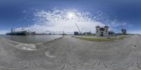 A sunny day in Bremen's harbor with a fish-eye view of the city. The pier offers a panoramic view of the cityscape, buildings, and water. The clear sky and calm water create a serene atmosphere.