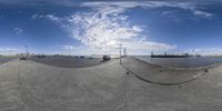 Bremerhafen, Germany: A calm coastal cityscape with high-rise buildings and a picturesque harbor. The fish eye perspective captures the city's urban design and architectural landmarks. Cars line the concrete street.
