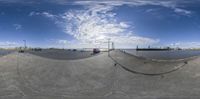 A fish eye view of a bustling city street in Bremerhafen, Germany. Cars line the side of the road as the city's high-rise buildings tower above. The calm waters of the harbor create a picturesque backdrop for the urban landscape.