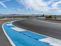 A race track in the USA with asphalt road and curves. Clouds fill the sky on a bright day, enhancing the thrill of racing. Experience the excitement of high-speed competition.