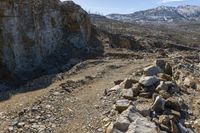 A rugged landscape in British Columbia's Okanagan Valley. Elevated mountain range with rock walls and outcrops. Clear sky above the valley. Gravel road cuts through the high terrain, showcasing the region's geology.