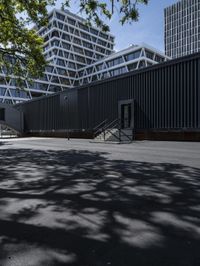 A modern black building in the heart of Berlin's business district. The architecture features a unique facade and a steel roof. The courtyard is surrounded by lush vegetation, providing a serene escape in the bustling city. Headquarters to a thriving urban design business.