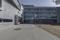 This is an image of a modern architecture building in the business district of Toronto, Canada. The property features a sleek facade with large windows and a grey, metal wall. Surrounding the building is an urban landscape with straight roads, asphalt, and curbs. The clear sky above contrasts with the open space and green grass. The image represents the urban design and modern architecture of Toronto's business district, making it a perfect representation for real estate or urban development concepts.