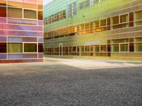 This image showcases modern architecture in the bustling business district of Holland, Netherlands. The vibrant, multicolored buildings with reflective windows stand tall against the clear blue sky. The open space of the empty parking lot complements the urban design of the city. The asphalt and gravel surfaces of the roads and parking lot create a contemporary look. The photo captures the essence of a typical day in this European city, where modern architecture and business merge seamlessly. This is a perfect representation of the architectural beauty and urban landscape of Holland, Netherlands.