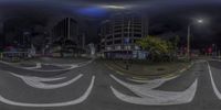 A 360-degree view of a busy city intersection, with traffic passing through. Modern architecture and skyscrapers dominate the skyline. The dark clouds create a dramatic backdrop. A snapshot of vibrant city life.