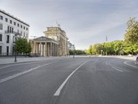 This stock photo captures the essence of city life in Berlin, Germany. The image showcases an empty street in Europe during the day, with lots of traffic on both sides. The classic architecture of the Brandenburg Gate stands tall in the background, adding to the charm of this famous tourist attraction. The road is paved with smooth asphalt, leading through a residential area in this urban setting. The clear sky above highlights the urban design and beauty of this European city. Perfect for illustrating concepts related to tourism, urban life, and human settlements.