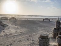 This is an image taken at dawn along the coastal shores of California, USA. The sandy beach is surrounded by water, with the ocean visible in the distance. The road leading to the beach is covered in dirt and gravel, adding to the natural and rugged feel of the landscape. A tall column rock formation can be seen on the shore, standing as a historic site and ancient relic. The sky above is filled with clouds, contrasting with the calm and serene surface of the water. This photo captures the peacefulness and beauty of the California coast at the break of day.