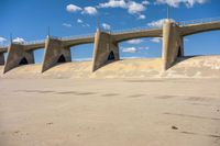 A skateboarder rides around on a concrete ramp in front of a bridge in Los Angeles, California. The clear sky and sunny day provide a perfect backdrop for their tricks.
