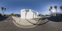 a 360 - view image shows an empty city street, with palm trees in the distance